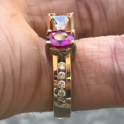 Stunning 1.01 Carat Round Pink Rubellite. Set in a hand designed ring with round diamonds and a trillion diamond.