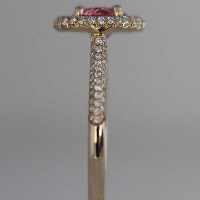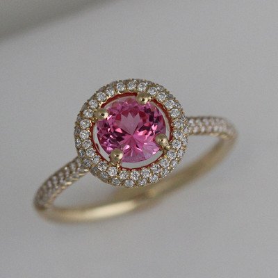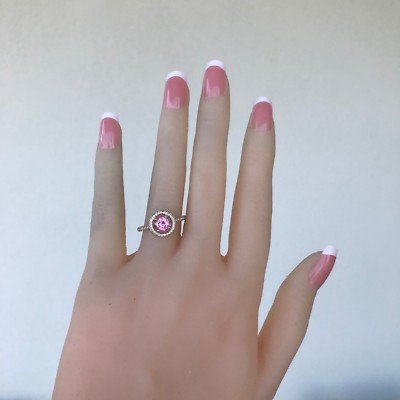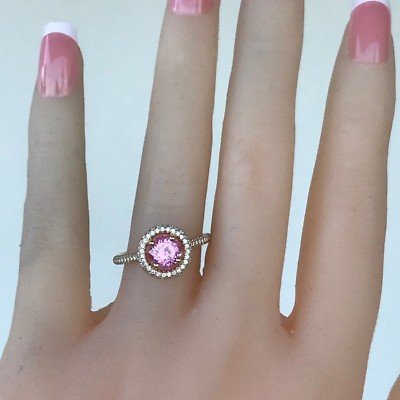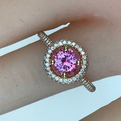 1. Center stone Carat Weight: 1.2 + 2. Color: Pink 3. Tone: Medium – Nice, 7.0 Out of 10 4. Hue: Fancy Pink. 3. Clarity: Excellent clarity, no inclusions to the eye. VS if diamond rating. 4. Cut: This stone has a excellent cut, 5. Origin: Sri Lanka (Ceylon) 6. Natural Sapphire with heat only. Diamonds: Shape: Round Carat Weight: 0.30 Total Carat Weight Color: E-G Clarity: VVS-VS