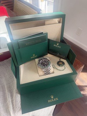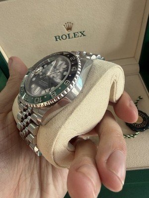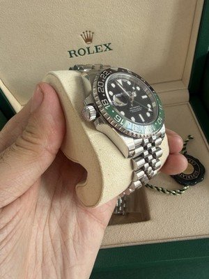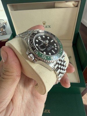 This is the highly sought-after Rolex GMT-Master II Ref. 126720VTNR, famously nicknamed the "Sprite". Released as a landmark "lefty" model, it features the winding crown and date aperture uniquely positioned on the left side of the 40mm Oystersteel case.