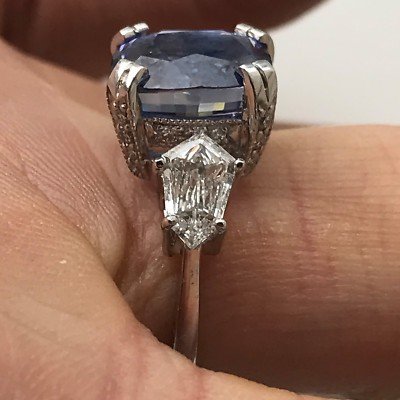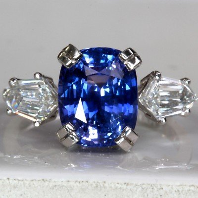 5.52 Carat Blue Ceylon Sapphire , set in platinum. 2 Side Bullet Cut Diamonds weighing a total of 1.10 Carats G-H , VS