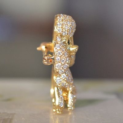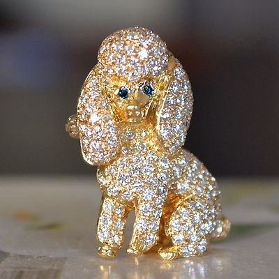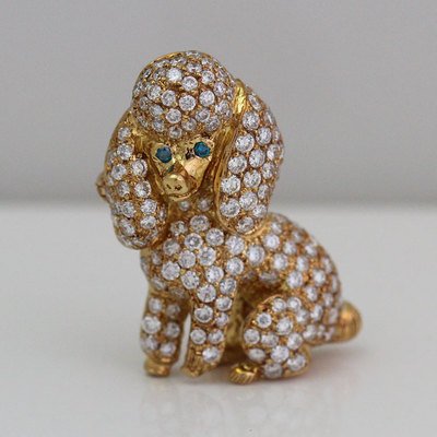 Dog Poodle Custom Brooch – 18k Yellow Gold and White and Blue Diamond – 2+ Carats Diamonds White Diamond Details: Carat Weight – 2.00 CT + Color – G-H Clarity – VS to SI Blue Diamond Details: 2 Natural Blue Diamonds with color enhanced and VS to SI Clarity Style number B4934004 |