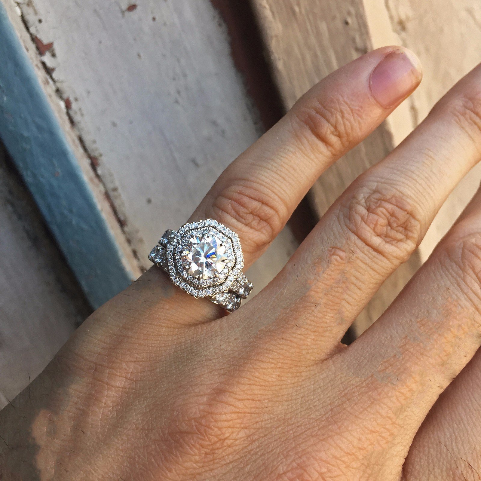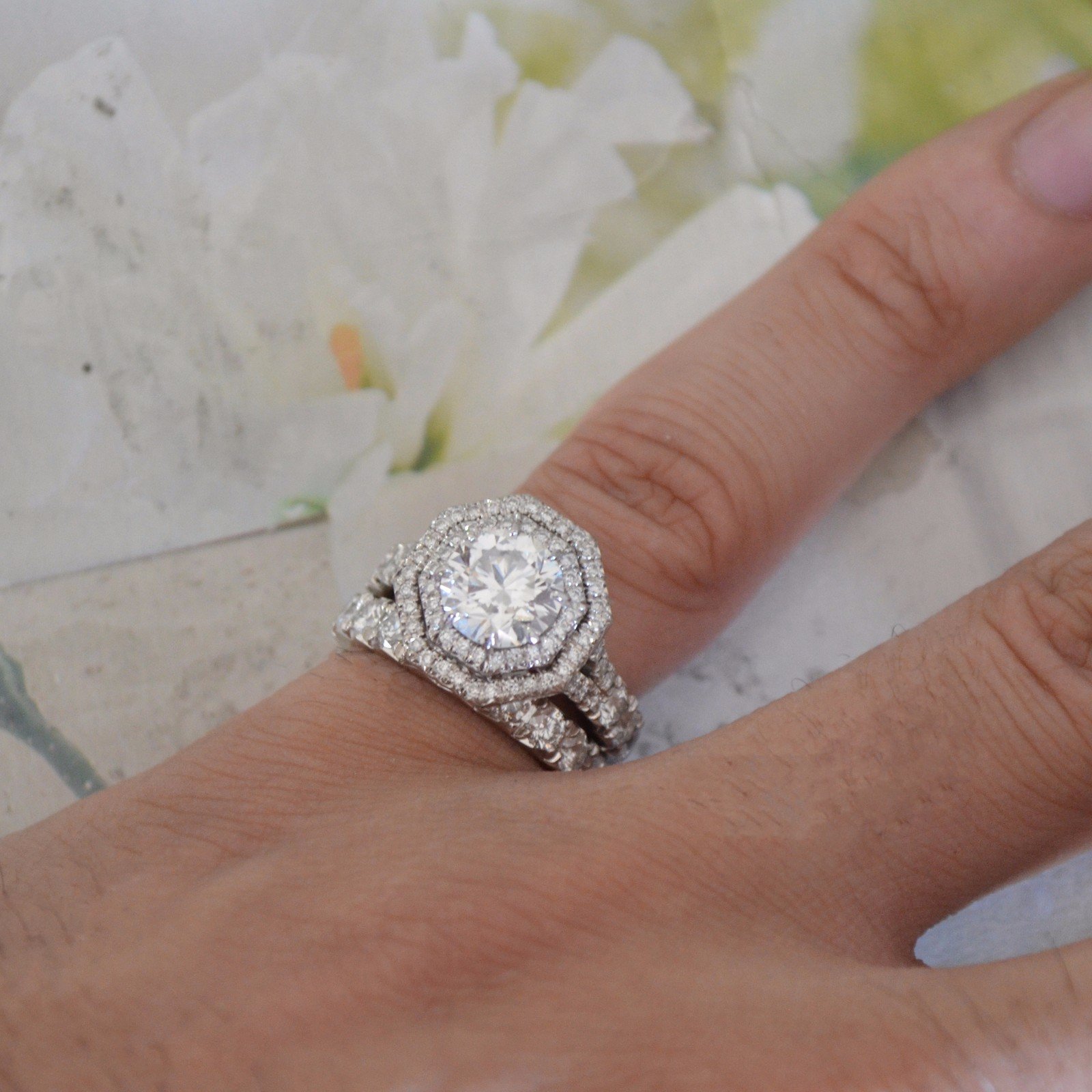 Double Row Hexagonal Halo – Round Center Diamond Engagement Ring- Pave Diamond