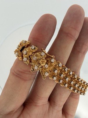 Up for sale is a magnificent, heavy-duty 18K Yellow Gold Nugget Link Bracelet. This is a substantial "statement" piece, weighing in at over 50 grams of solid 18k gold, accented by an impressive array of 76 natural diamonds. The textured nugget finish provides a classic, high-luxury aesthetic that catches the light from every angle.