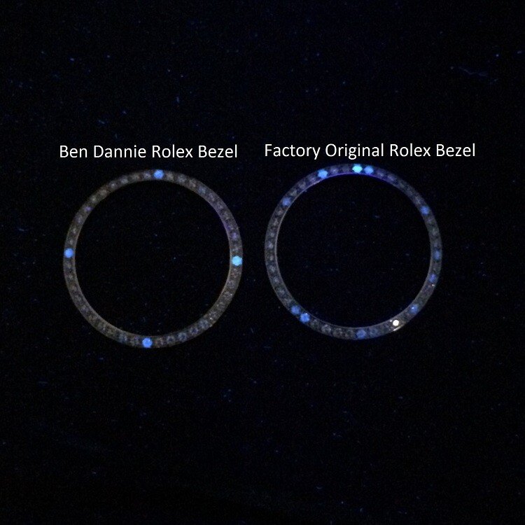 I had noticed that Rolex will use florescent stones (florescence is an effect that can be seen in diamonds in dark room with black light or strong UV light) they are just in there at random. I was going to use only no florescent stones but decided it would be cool to put a strong blue florescent stone at 3,6,9 markers and a very strong blue at 12 marker.)