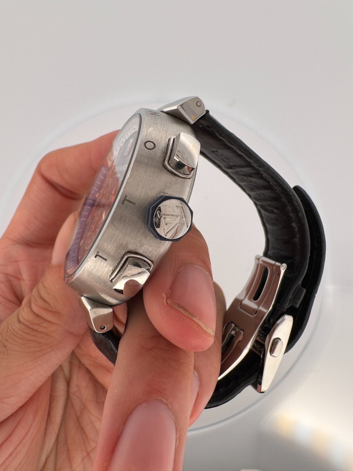 The signature stainless steel case, engraved with "Louis Vuitton" around the bezel, is paired with a durable rubber or steel bracelet, reflecting its sport-luxury heritage. A scratch-resistant sapphire crystal and 100-meter water resistance make it as functional as it is stylish. In amazing condition, this watch retains its sharp factory lines and serves as a testament to Louis Vuitton’s expertise in technical watchmaking.