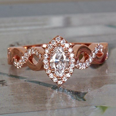 Marquise Diamond Halo Engagement Ring Set In Rose Gold and Diamonds Twist Shank