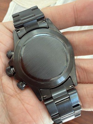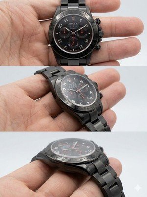 Up for auction is a striking, highly customized interpretation of the Rolex Cosmograph Daytona. This timepiece has been transformed into a unique, stealthy masterpiece with an aggressive aesthetic. It features a complete Satin Black PVD/DLC coating across the entire case, bezel, and bracelet. The defining feature is a completely custom reverse-panda dial in black with deep red chronograph sub-dials and matching customized hands, creating a bold, high-contrast presence on the wrist unlike any factory model.