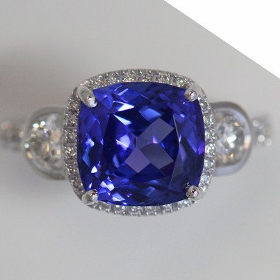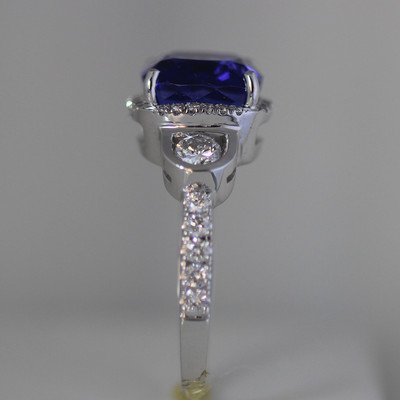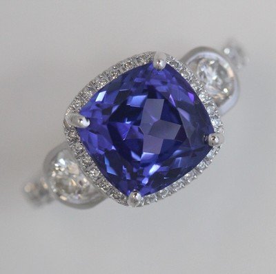 Stunning 5.25 Catat + Vivid Blueish Purple Cushion ideally cut  Tanzanite with flashes of violet. Set in a hand designed 18k White Gold ring with over 35 diamonds.