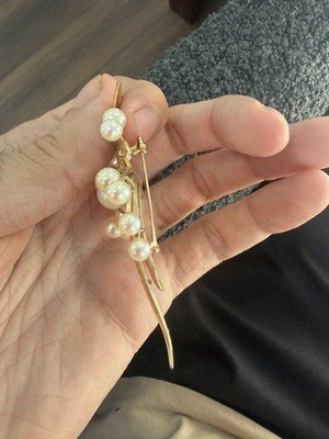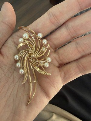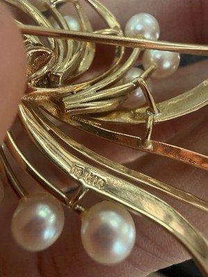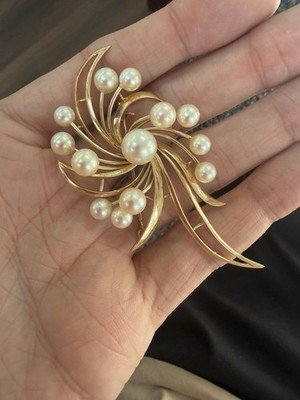 Vintage Mikimoto 9mm Akoya Pearl Brooch in 14K Yellow Gold Ribbon Spray Design – 1.5”