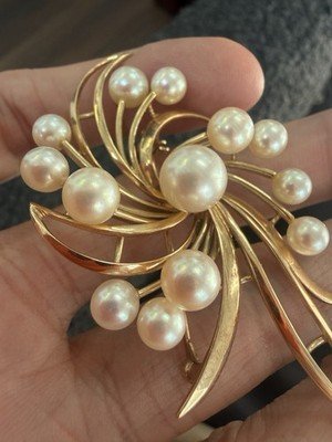 • Hallmarks: “M” in shell logo (Mikimoto) and “K14”