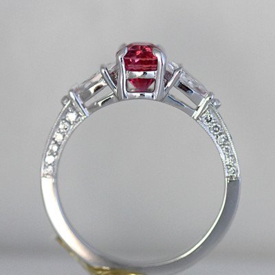 5. Stone is set in 18k white gold flanked by two pear shape diamonds.